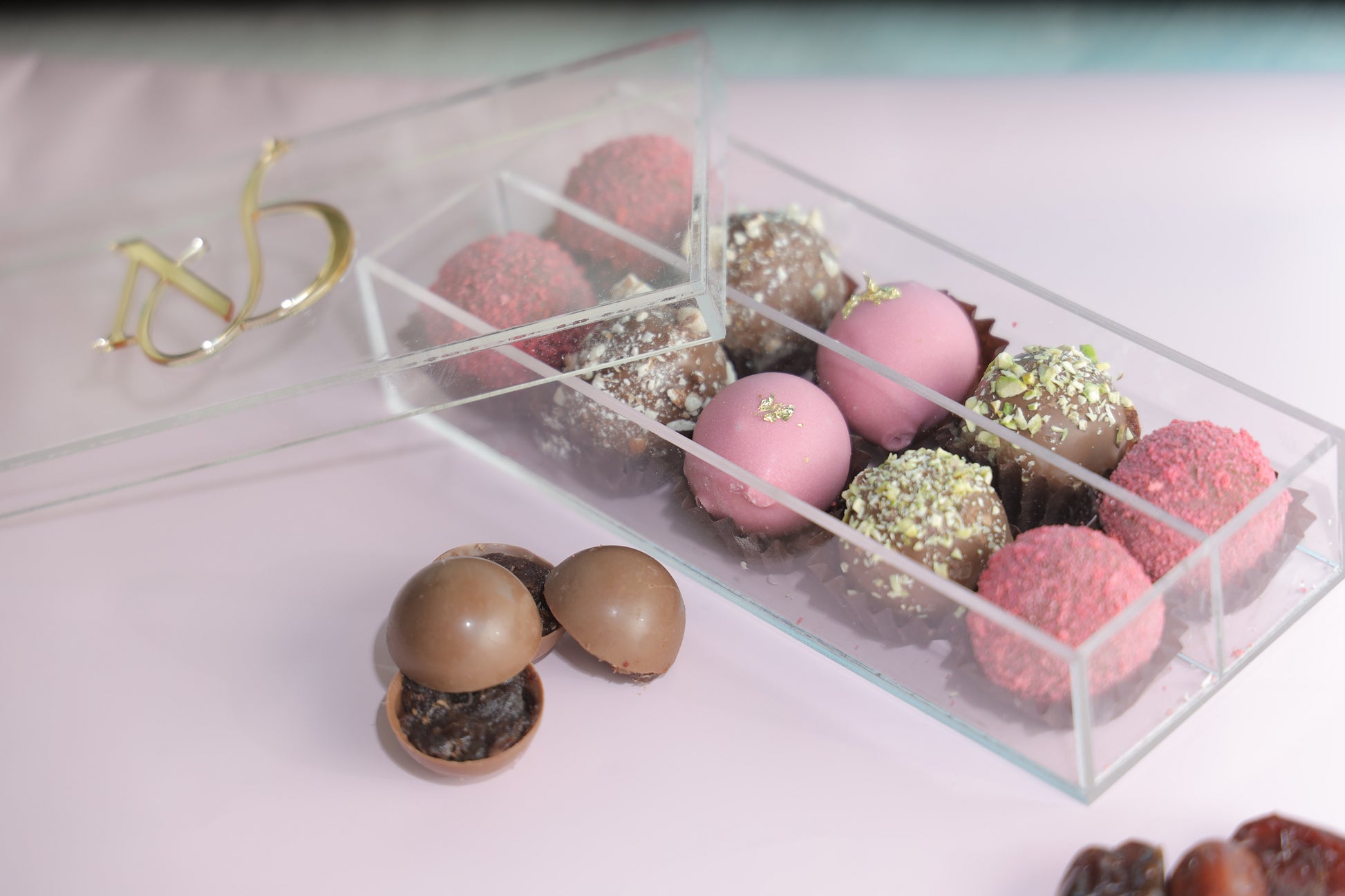 10pcs assorted truffles filled with Peanut butter, pistachio, almond lotus flavors