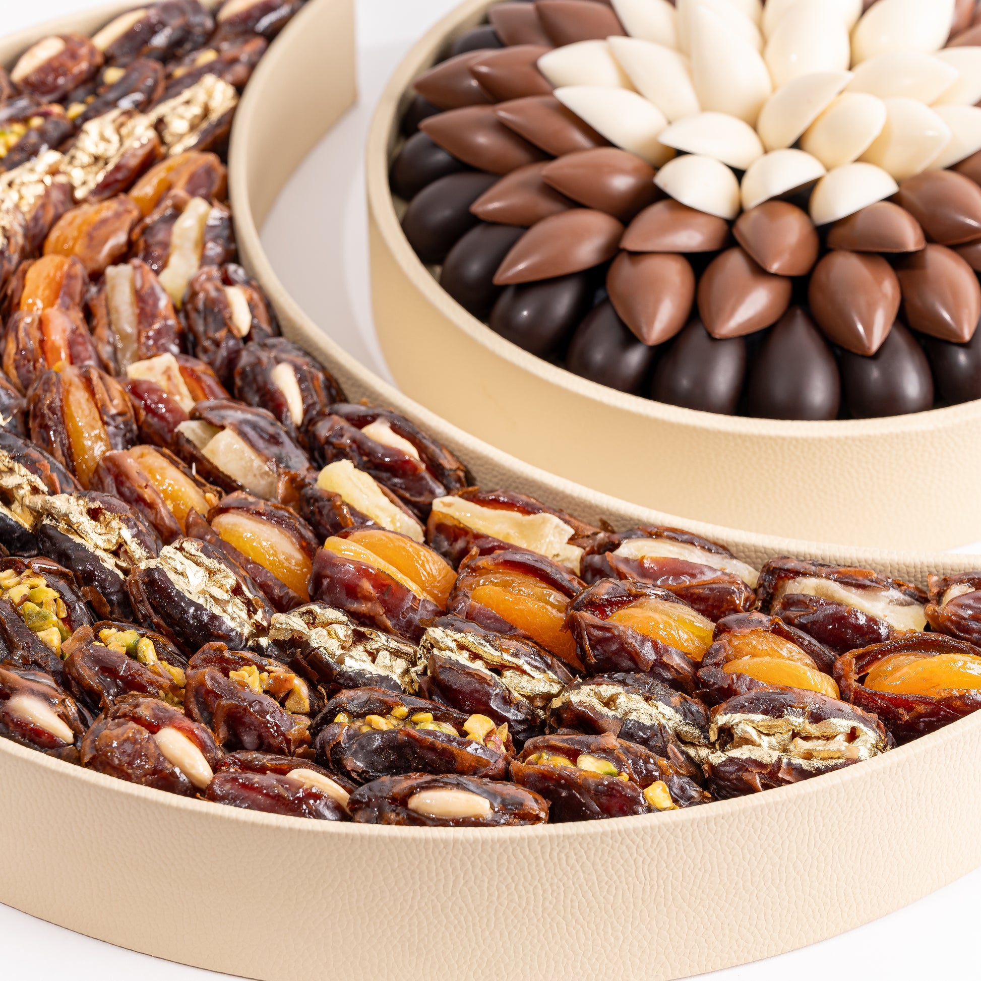 This distinguished collection pairs a crescent of premium stuffed dates with a petal-arranged chocolate assortment, offering contrast, balance, and visual elegance. Naturally sweet dates filled with fruit and nuts meet the smooth richness of white, milk, and dark chocolates—crafted to be shared generously and remembered.