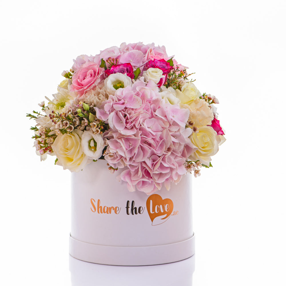 Experience luxury with our exquisite Flower Box, featuring a blend of Hydrangea, Chrysanthemum, Lisianthus, White Rose, Purple Rose, and Wax, meticulously arranged to perfection. Elevate any occasion with this stunning display, available in your choice of White, Pink, or Red round boxes. Make a statement of elegance and sophistication with every delivery.