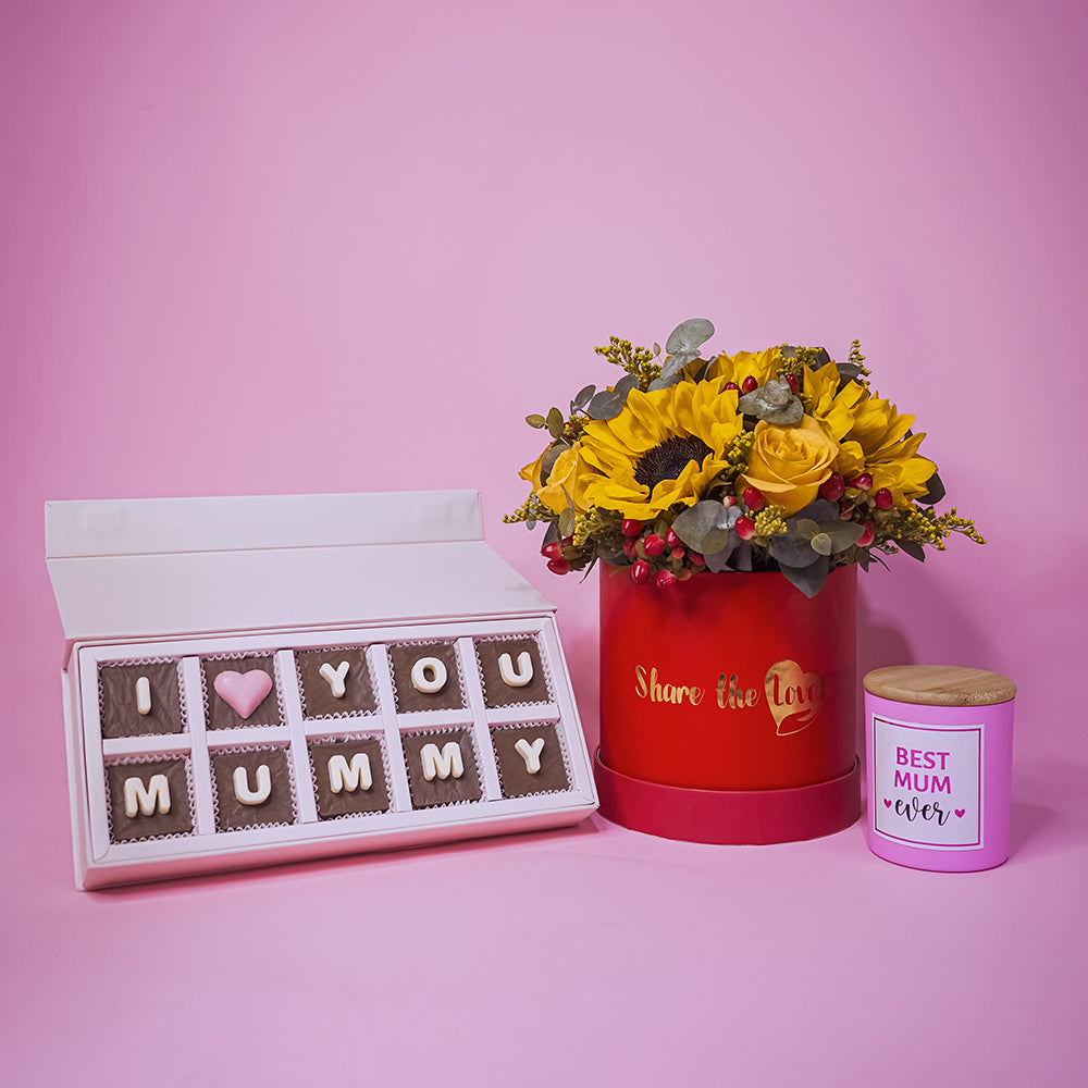 Introducing our "You Are My Sunshine Mummy" combo gifts, designed to brighten her day and warm her heart! This delightful package includes a radiant Smile Bright flower box, a beautifully scented candle for moments of relaxation, and irresistible "I Love You Mummy" chocolates to sweeten every moment. Show your appreciation and love with this thoughtful combination that's sure to make her smile shine brighter than ever before.