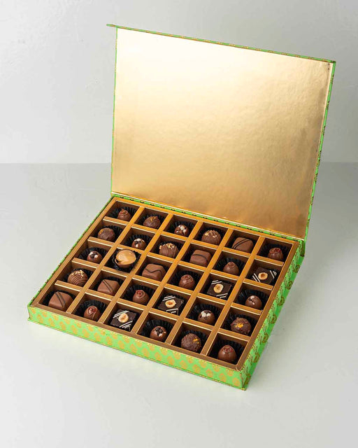Your Gift Contains:• 20 Assorted chocolate filled in Pistachio, Hazelnut, Peanut, Speculoos, Caramel and Roche• 5 sugar free Pistachio Dates Bites•...