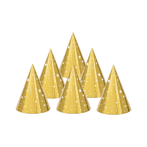 Party hats Stars made of paper in gold metallic colour with white print. Height approx. 16 cm, diameter approx. 10 cm.