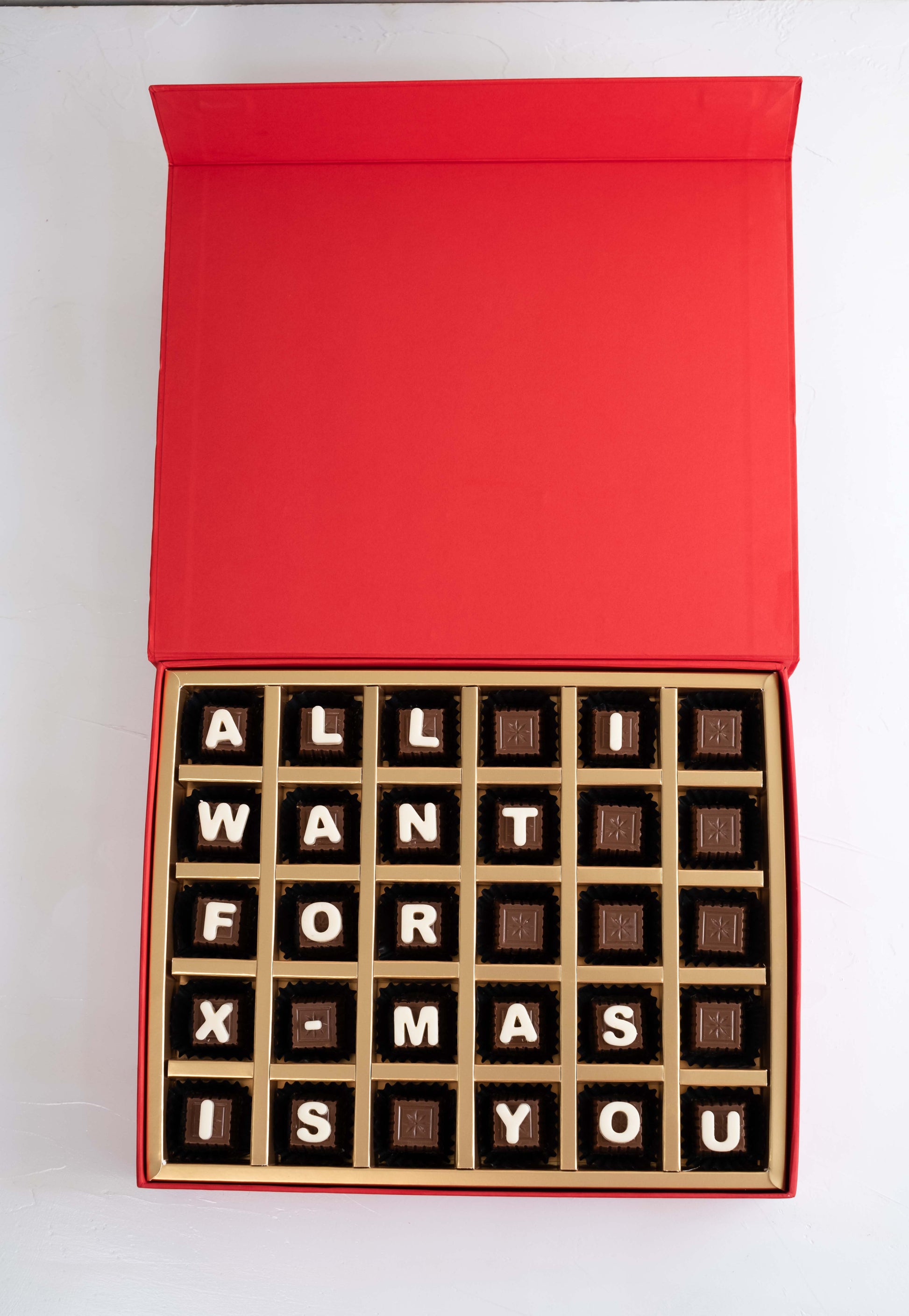Your Gift Contains: • 30 pieces assorted Milk chocolates with message All I want for Xmas is You • Flavors: Pistachio Praline, Rice Crispy, Rocher, Sepculoos, Hazelnut Praline • Box Size: LxBxH: 32x26x6cm • Weight of Chocolate: 550 grams Handling and Storage • Keep away from direct heat and sunlight • Best stored between 12-18 °C • Suitable for vegetarians • Not suitable for those allergic to seeds, nuts, dairy CONTAINS NUTS AND NUTS BASED PRODUCTS |