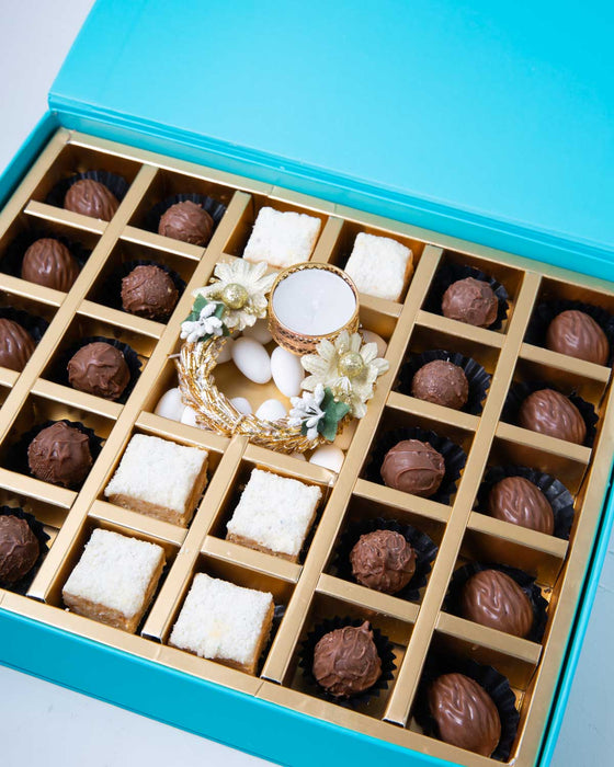 | Your Gift Contains: • 10 pieces assorted Milk chocolate with • 10 pieces milk chocolate truffles • 6 pieces coconut cake in white chocolate • 1 Diya with tealight Approx. weight of chocolates and coconut cake 450gms Box Size: LxBxH: 31x25.5x6.5cm HANDLING AND STORAGE Keep away from direct heat and sunlight Best stored between 15-20 °C Suitable for vegetarians Not suitable for those allergic to seeds, nuts, dairy, and eggs. Read the ingredients carefully at the bottom of the box before consuming |