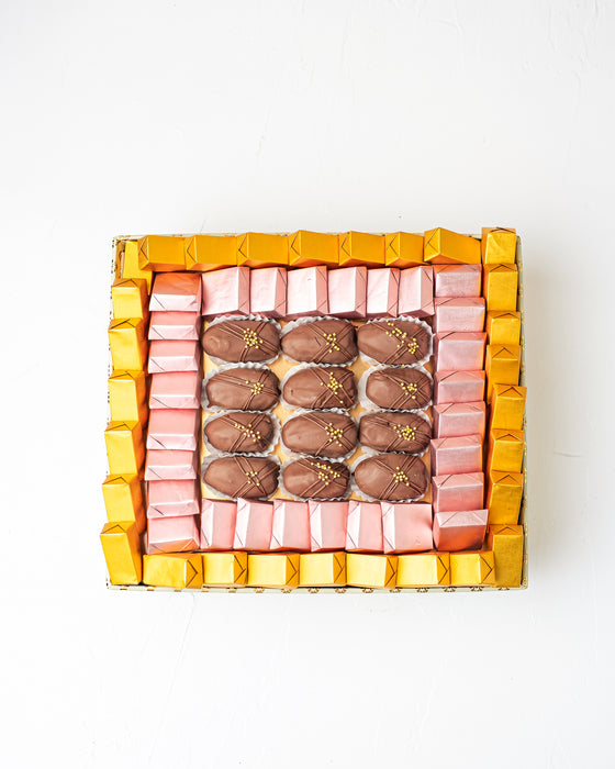 | Your Gift Contains: • 12 x Milk chocolate covered dates • 57 assorted milk chocolates • Flavors: Pistachio, Hazelnut, Speculoos, Rice Crispy, Salted Caramel, Peanut Butter, Roche and Kinder • Box Size: 24x24x7cm Handling and Storage • Keep away from direct heat and sunlight • Best stored between 12-18 °C • Suitable for vegetarians • Not suitable for those allergic to seeds, nuts and dairy CONTAINS NUTS AND NUTS BASED PRODUCTS |