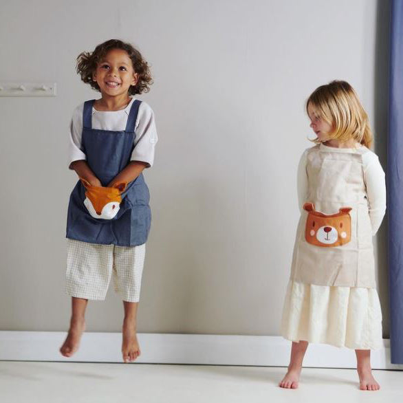 | Designed and made by ThreadBear Design Pretty linen aprons for boys and girls ages 3-8 years old. A fox linen aprons for boys and girls. A sweet little animal face forms the pocket on the apron apron. The cross over straps at the back are adjustable via a metal eyelet. Machine washable Suitable Age: 3-8 years old. Dimensions: Height: 48cms x Width: 56cm |