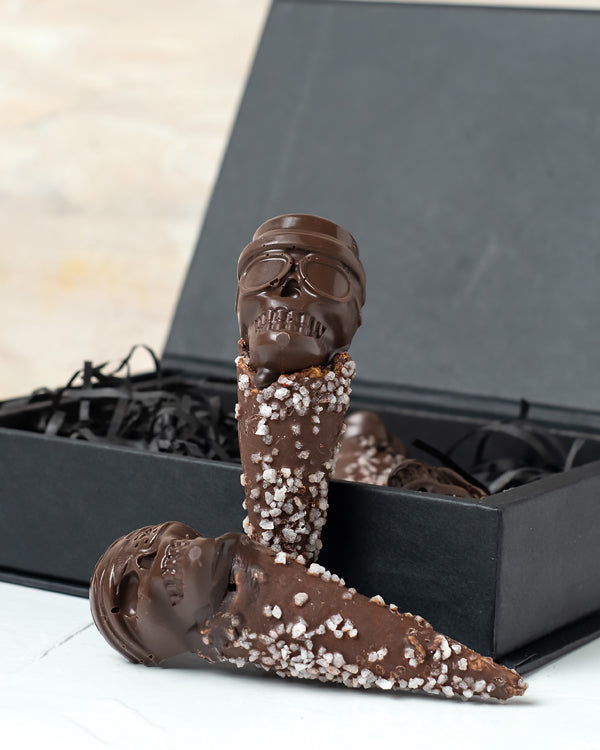 | Your Gift Contains: • Chocolate cones with cake topped with chocolate skulls • Belgian Milk chocolate • Cake flavor: Brownie/Vanilla/Red Velvet • Box Size: 18×12.5x4cm Handling and Storage • Keep away from direct heat and sunlight • Best stored between 12-18 °C • NOT Suitable for vegetarians • Not suitable for those allergic to seeds, nuts, dairy CONTAINS NUTS AND NUTS BASED PRODUCTS |