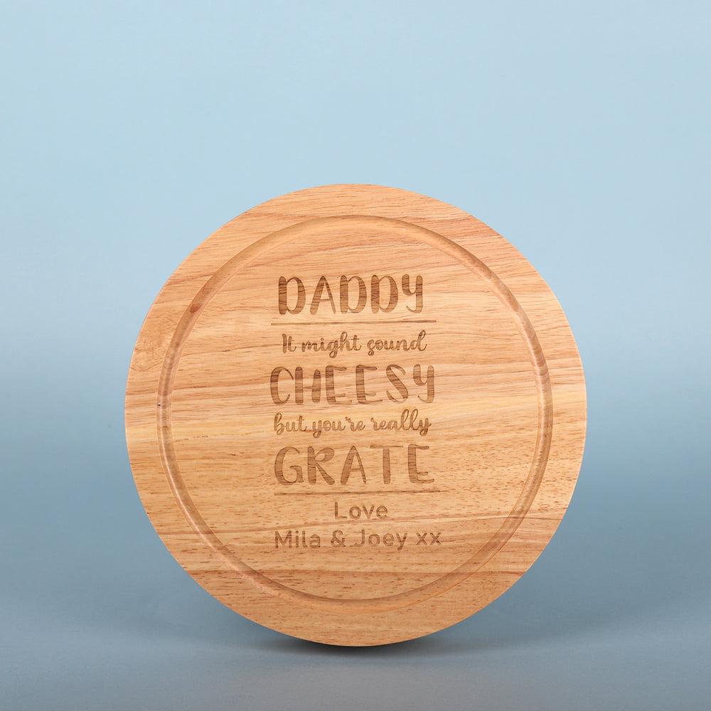 Our "Personalized Cheeseboard is the perfect combination of functionality and sentimentality. Crafted from high-quality materials, this cheeseboard is not only a practical serving tool but also a cherished keepsake. Write your message, a memory, his favourite dailogue or his favourite joke to remind him, how much he is loved.