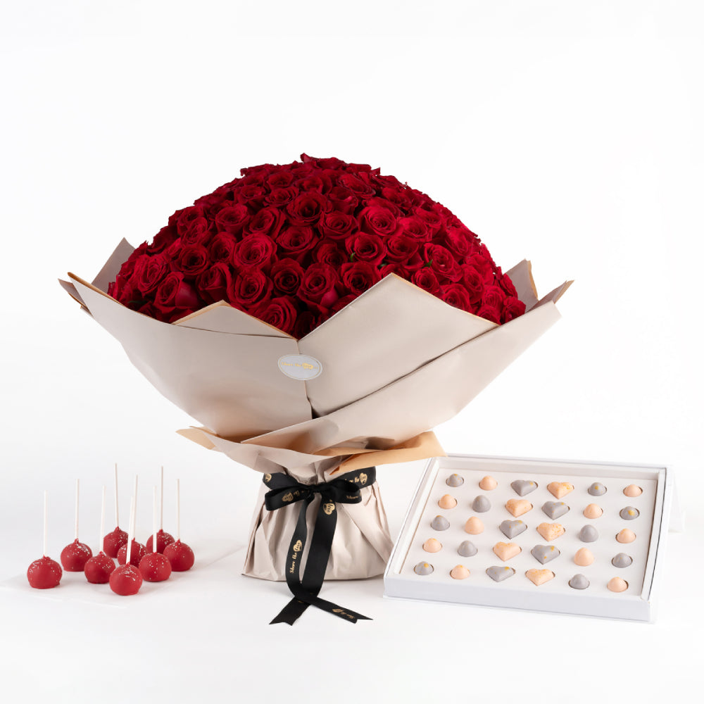 Elevate your expressions of love with our luxurious bundle, featuring captivating Red Roses elegantly wrapped. Pair this timeless gesture with NJD's Valentine's Assortment, a decadent selection of assorted chocolates. Add a touch of whimsy and fortune with NJD's Year of the Dragon Special Cake Pops, delightful treats crafted to celebrate the occasion