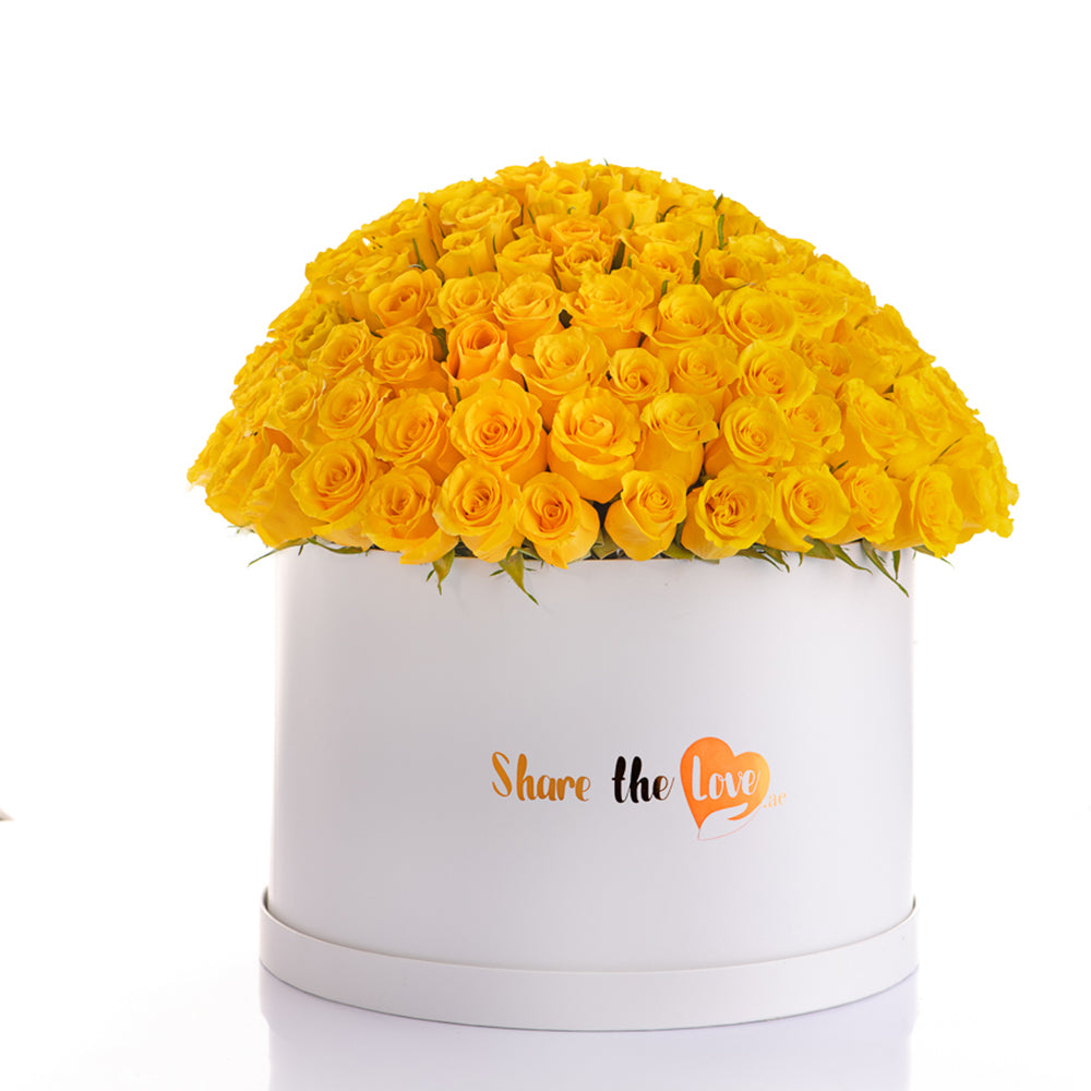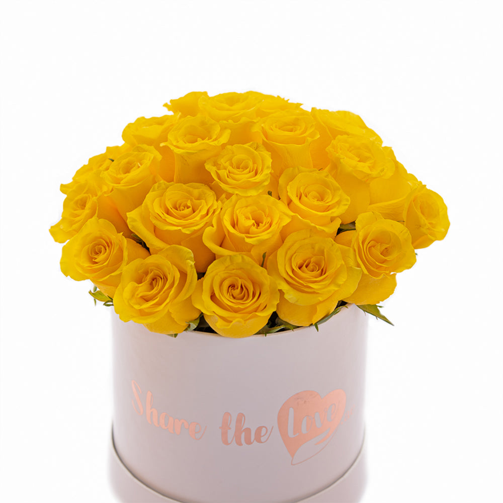 Brighten someone's day with our Yellow Roses Box, a radiant display of joy and warmth. This charming arrangement features a dozen vibrant yellow roses, carefully arranged in a stylish box. Symbolizing friendship, happiness, and positive energy, these blooms are perfect for celebrations, uplifting moments, or simply to spread cheer. Share the sunshine with our Yellow Roses Box, a thoughtful and vibrant gift that adds a burst of color to any occasion. Choose from White, Pink or Red round box.